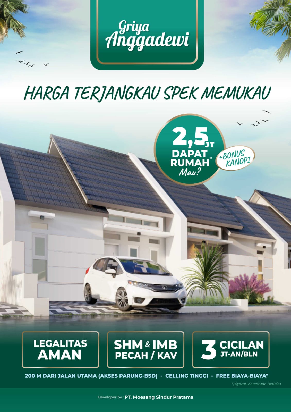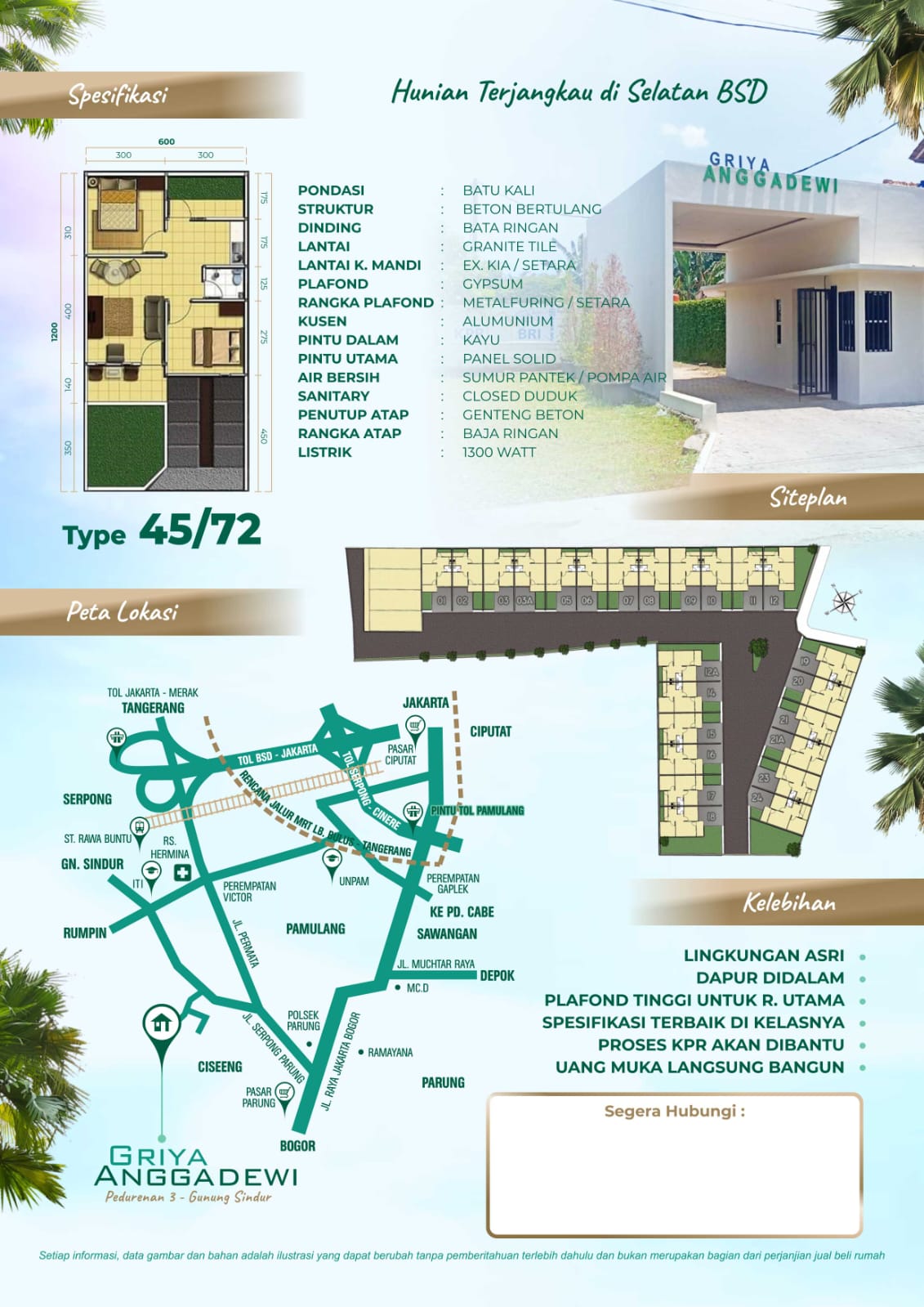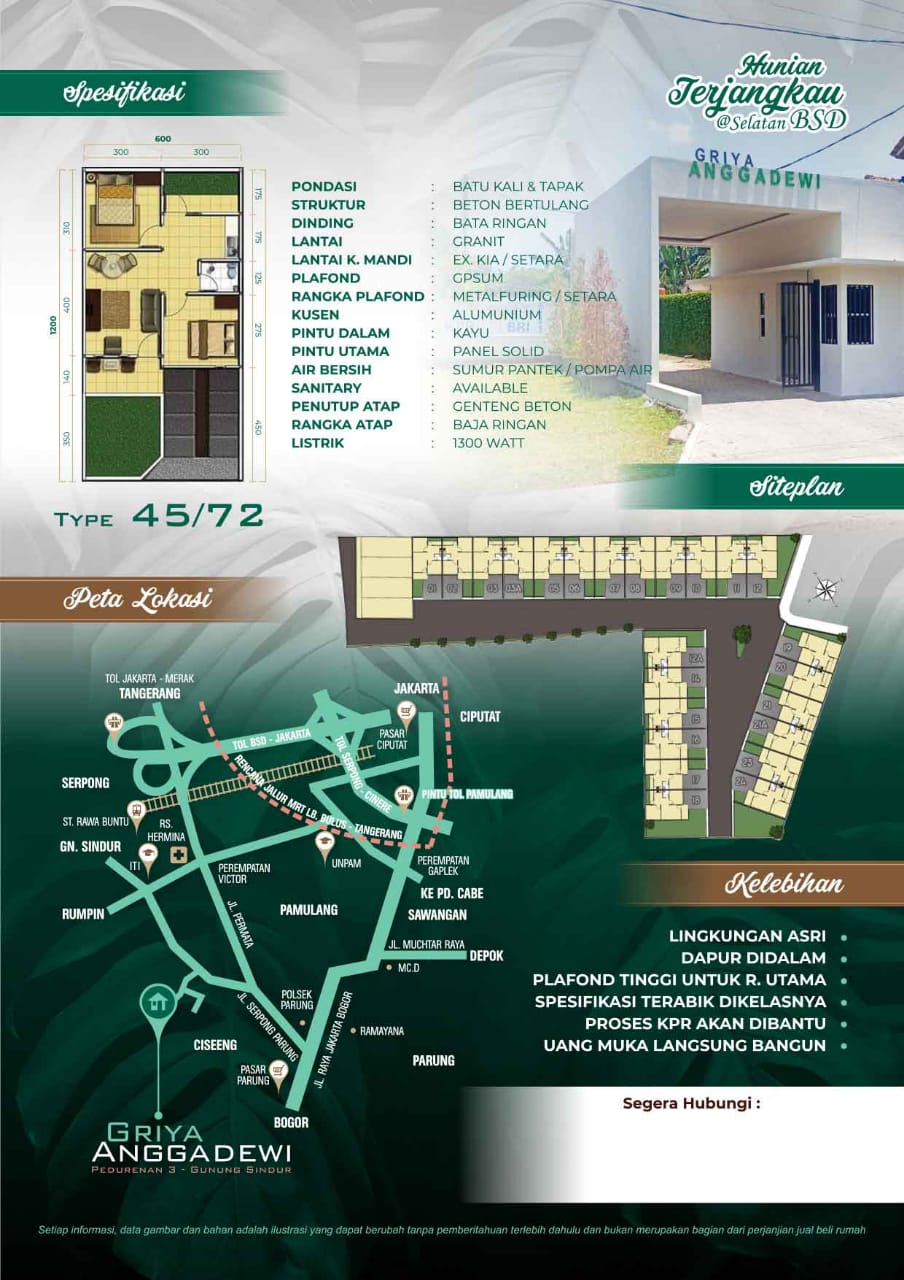 Griya Anggadewi rumah 1 lantai strategis di parung bogor, menawarkan rumah dengan spek memukau namun dengan harga yang terjangkau. Lagi promo juga loh Tanpa DP alias Dp 0%, Gratis BPHTB, AJB dan SHM.